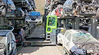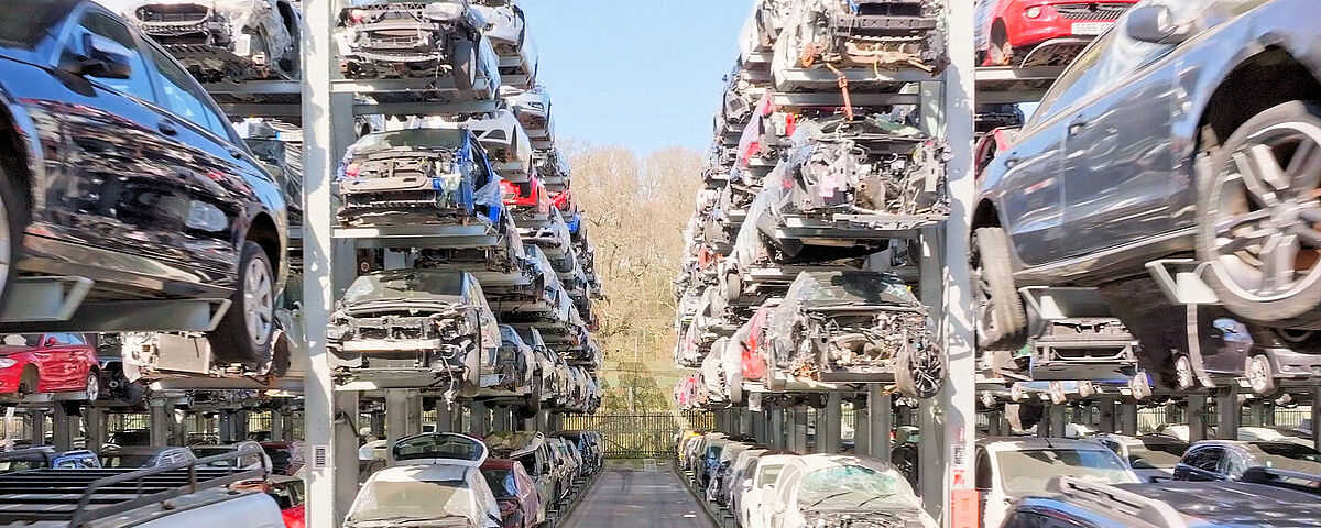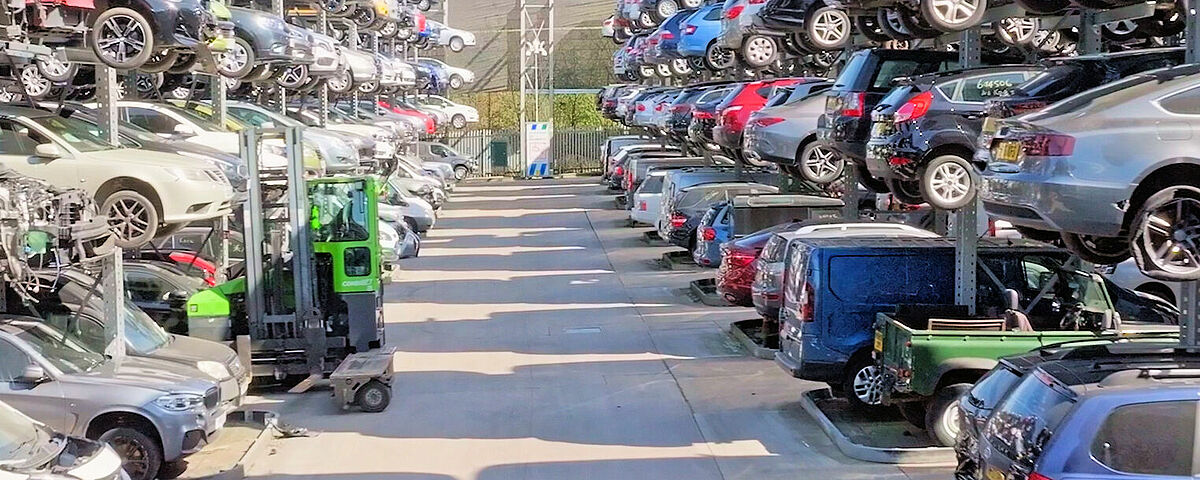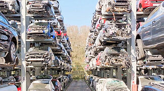 Silverlake Automotive Recycling, Hampshire, stores cars, SUVs and vans in cantilever racks from OHRA in order to have as many end-of-life vehicles as possible in direct access at all times. Thanks to the shelves, which are over 8 metres high, five vehicles weighing up to 2 tonnes each can be safely "stacked" on top of each other. The rack rows are also equipped with guide rails so that the old vehicles can be stored and retrieved using a side loader. This means that the aisles between the shelves can be kept particularly narrow and more shelves can be placed in the space. Silverlake can therefore store around 2,500 end-of-life vehicles on the site.